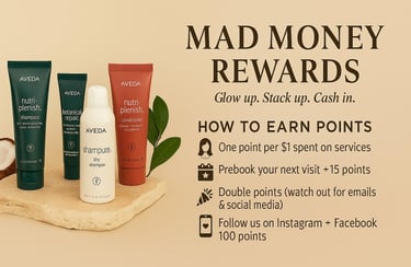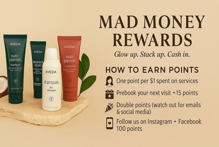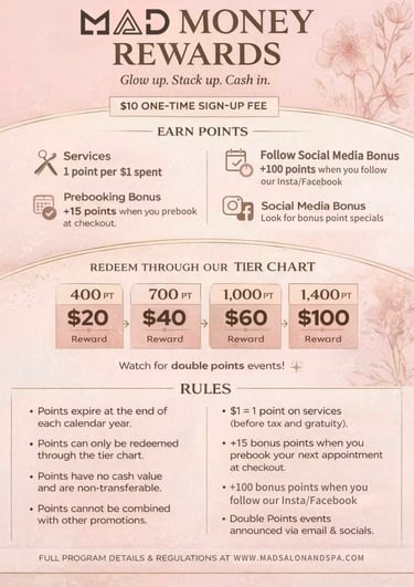 MAD Money Rewards is a loyalty program offered by MAD Salon & Spa. Members earn reward points on qualifying purchases and activities, which may be redeemed only through designated reward tiers. Participation in the program constitutes acceptance of these Rules & Regulations.